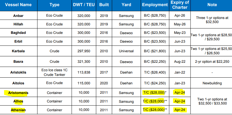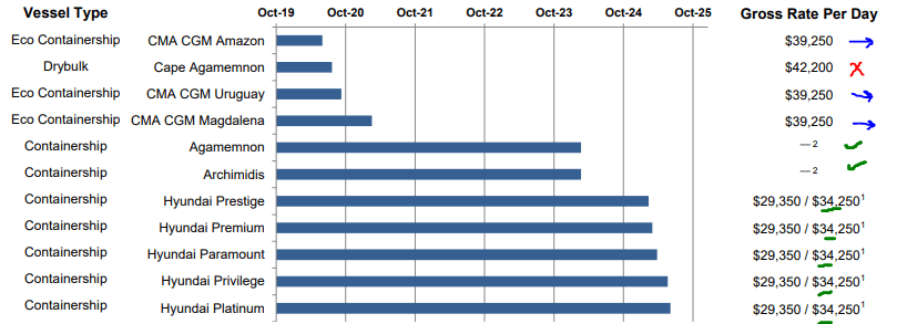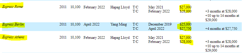 Capital Maritime recently added the extensions (in mid-2019) through April 2024 at $28k/day. They wouldn’t do those agreements below market nor would their undisclosed counterparty (highly likely to be Hapag Lloyd per their fleet list) agree to anything other than what was indeed ‘market’ at the time.