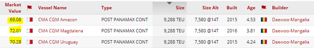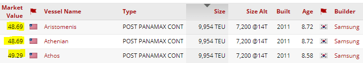 There aren’t any clear comps for these vessels, except from Danaos Corp (DAC), which has their vessels fixed (for less duration) at almost identical levels of $27-$28k/day.
