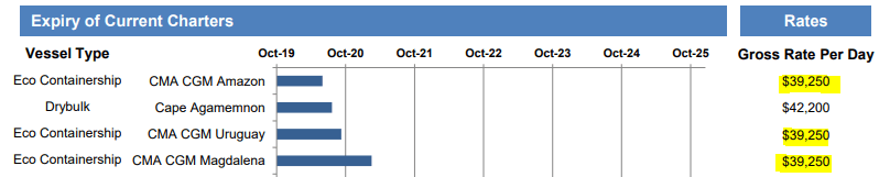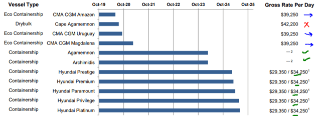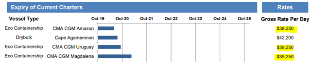 CPLP is ahead of the curve for IMO 2020 compliance and they unveiled a plan last year, with shipyard options secured, to install scrubbers on their entire core fleet. This summer, CPLP further improved their coverage by fixing their two 8k TEU vessels through February 2024 in conjunction with scrubber installations. They disclosed expected EBITDA instead of TCE, but I estimate the equivalent rate of about $24k/day, which is a significant increase from previous short-term employment at $18k/day.