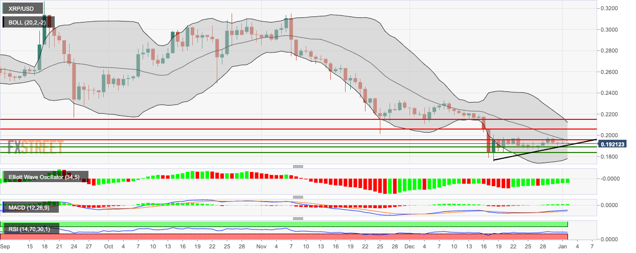 XRP/USD fell from $0.193 to $0.192 in the early hours of Thursday. The price faces resistance at the 20-day Simple Moving Average (SMA 20) curve and support at the upward trending line. The price volatility is decreasing rapidly, as seen by the shrinking of the 20-day Bollinger jaw. The Elliott Oscillator has had six straight green sessions, indicating sustained bullish sentiment, while the Moving Average Convergence/Divergence (MACD) indicates increasing bullish momentum.