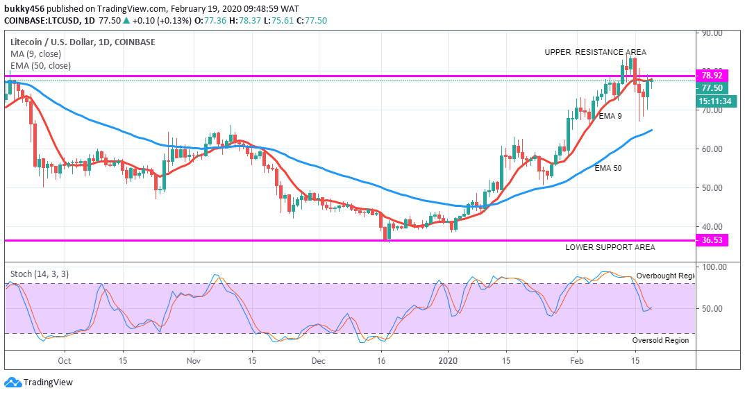 Price of Litecoin is initially up at $77.84 due to bulls’ brief return in the resistance area above the two EMAs. This suggests an uptrend in the price of the coin.