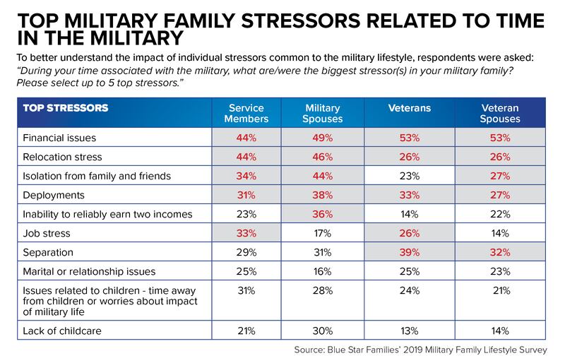 Part of that is financial stability. The top stressors this year for active duty and spouses were financial issues and relocation. Of those surveyed, 63 percent said they experience stress due to their current financial situation; with the top contributors to that being spouse unemployment or underemployment; out-of-pocket housing and relocation costs, excessive credit card debt and out-of-pocket child care costs.