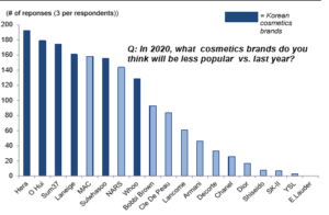 • The popularity of Korean cosmetics brands as a whole is fading, and they are being alienated from the competition with European and Japanese peers, as they are perceived to lag behind in quality and brand prestige.