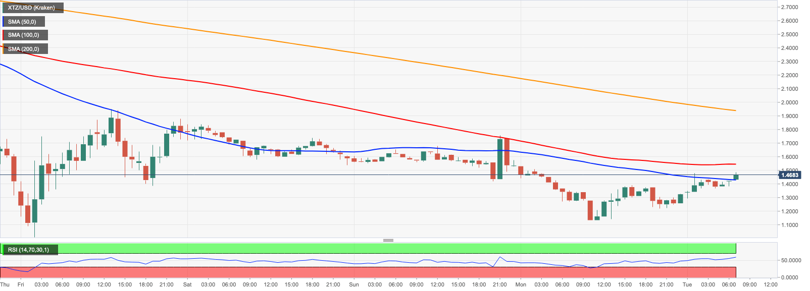 XTZ/USD settled above the local resistance level created by SMA50 1-hour at $1.4300. However, a stronger barrier awaits the coin at $1.5450. SMA100 1-hour located on approach to this line stopped XTZ recovery on Sunday. If it is broken, the upside will gain traction with the next target at $1.75 (March 15 high), followed by psychological $1.80 and $1.84 (March 14 high).