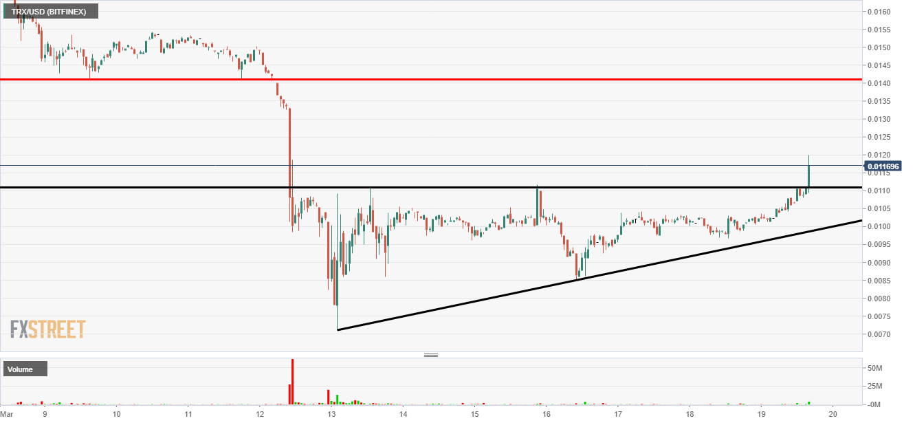 All of the major cryptos have bounced today as bullish sentiment returned to the crypto sphere. TRON struggled after breaking though the major support levels during the fall. On March 12th along the pair fell 42% as fear gripped the market. Since then we have seen a period of consolidation and now a break higher.