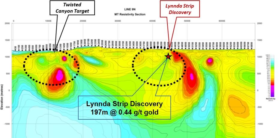 Figure 2. East-West Lynnda Strip AMT resistivity line showing Lynnda Strip discovery and new Twisted Canyon target, three kilometres to the west