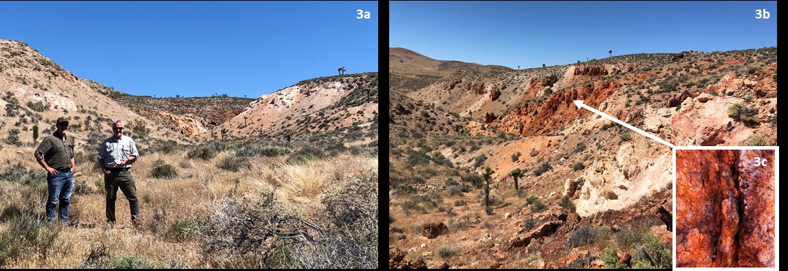 Figure 3. Photos of Corvus Gold’s new Hidden Valley target northeast of AngloGold Ashanti’s Silicon project: 3a. Ron Largent (Chairman) & Jeff Pontius (CEO) at the new Hidden Valley target; 3b. Central Alteration Zone; 3c. High-level chalcedonic veining