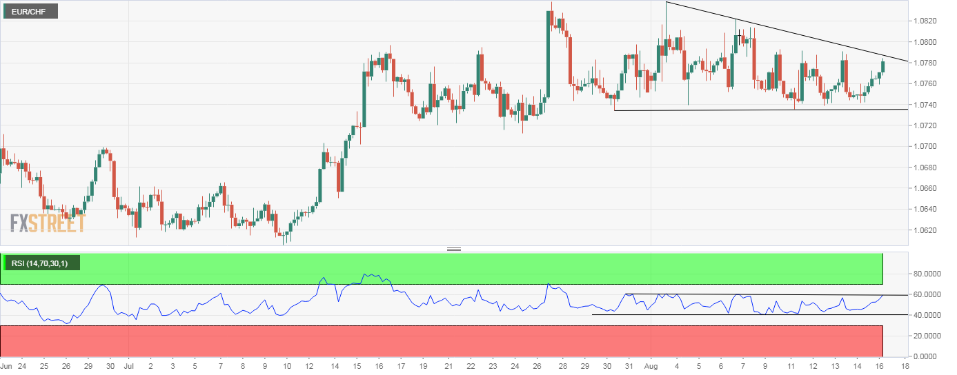 EUR/CHF is currently trading at 1.0781, representing a 0.20% gain in Asia.