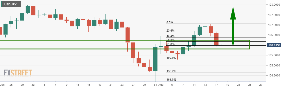 It would be textbook stuff should the price simply pick up all of the liquidity at this confluence juncture of the 61.8% Fibonacci retracement level and simply continue in its upside trajectory, extending the late July reversal.