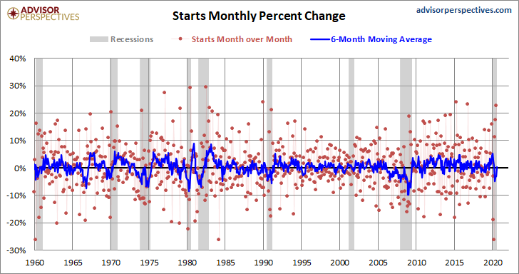 The extreme volatility of this monthly indicator is the rationale for paying more attention to its 6-month moving average than to its noisy monthly change. Over the complete data series, the absolute MoM average percent change is 6.3%. The MoM range minimum is -26.4% and the maximum is 29.3%.