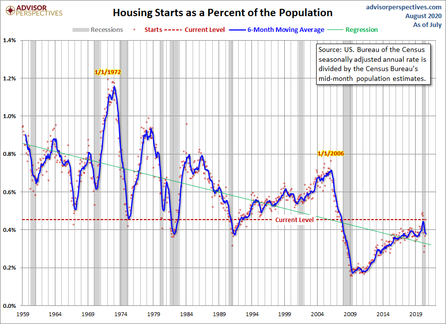 Here is the data with a simple population adjustment. The Census Bureau’s mid-month population estimates show substantial growth in the US population since 1959. Here is a chart of housing starts as a percent of the population. We’ve added a linear regression through the monthly data to highlight the trend.