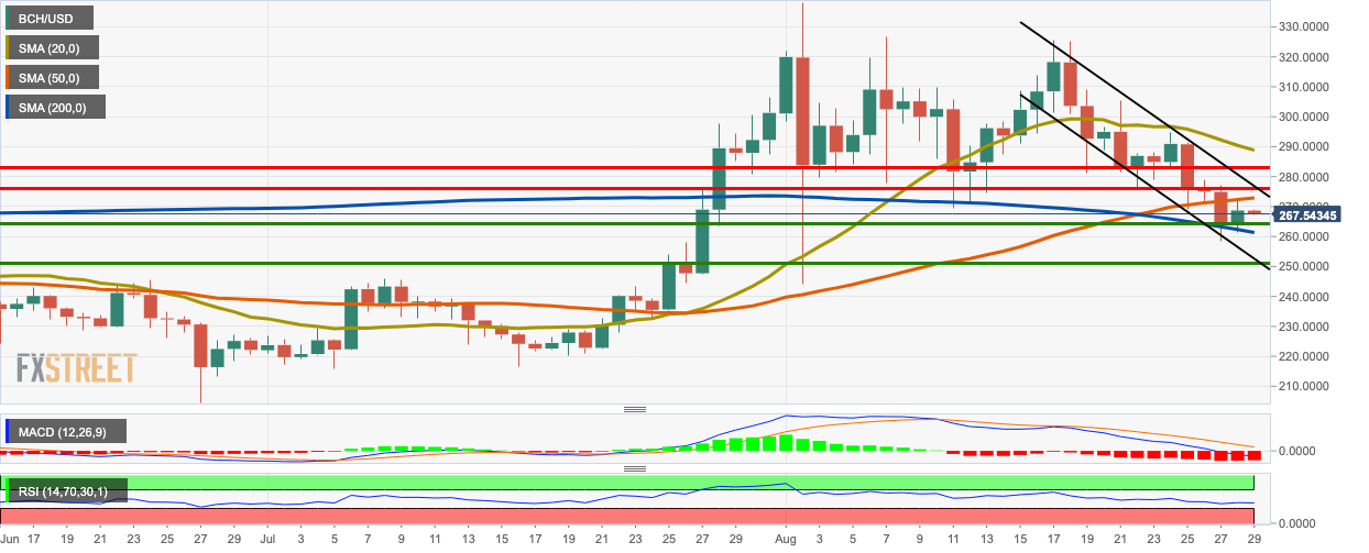 BCH/USD bears stepped in following a bullish Friday as the price dropped from $268.67 to $267.53. The price is trending in a downward channel formation and is presently sandwiched between the SMA 50 and SMA 200 curves. The MACD shows sustained bearish momentum.