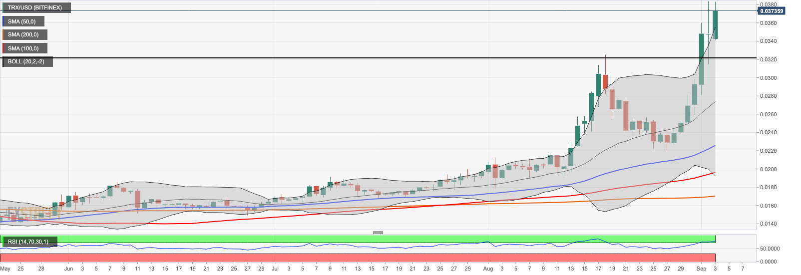 - TRX/USD retains bullish bias and may retest $0.04 in the nearest future.