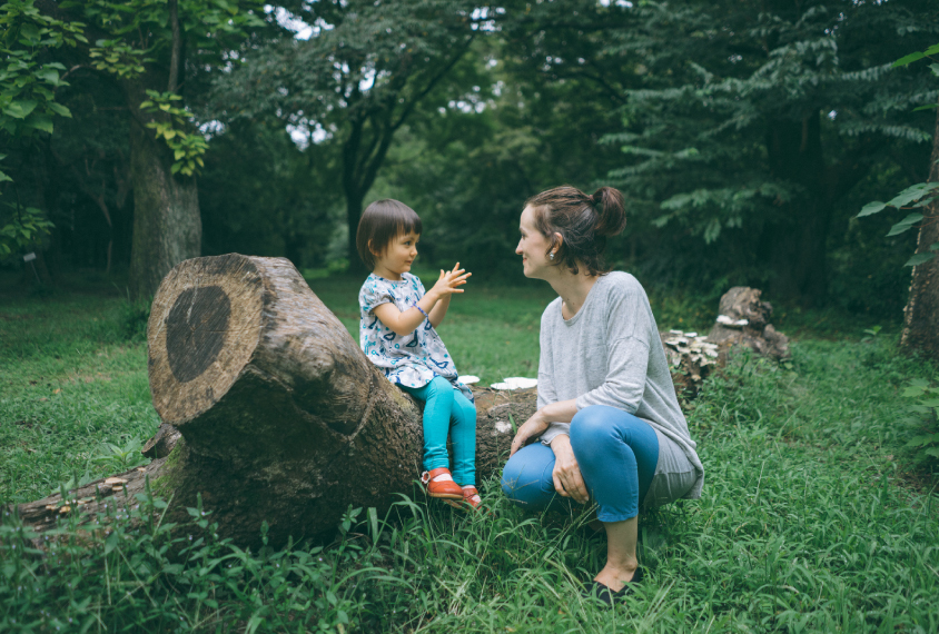 Mother and child having a conversation in nature.