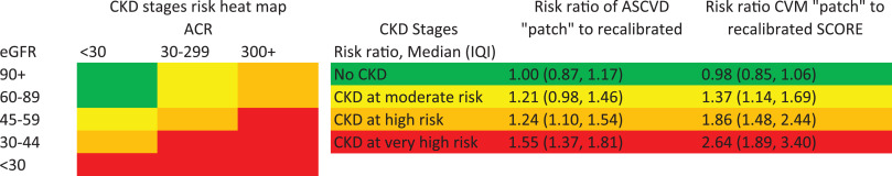 We confirmed the prediction improvement with the CKD Patch for CVD mortality beyond SCORE and ASCVD beyond PCE in validation datasets (Δc-statistic 0.027 [95% CI 0.018–0.036] and 0.010 [0.007–0.013] and categorical net reclassification improvement 0.080 [0.032–0.127] and 0.056 [0.044–0.067], respectively). The median (IQI) of the ratio of predicted risk for CVD mortality with CKD Patch vs. the original prediction with SCORE was 2.64 (1.89–3.40) in very high-risk CKD (e.g., eGFR 30–44 ml/min/1.73m2 with albuminuria ≥30 mg/g), 1.86 (1.48–2.44) in high-risk CKD (e.g., eGFR 45–59 ml/min/1.73m2 with albuminuria 30–299 mg/g), and 1.37 (1.14–1.69) in moderate risk CKD (e.g., eGFR 60–89 ml/min/1.73m2 with albuminuria 30–299 mg/g), indicating considerable risk underestimation in CKD with SCORE. The corresponding estimates for ASCVD with PCE were 1.55 (1.37–1.81), 1.24 (1.10–1.54), and 1.21 (0.98–1.46).